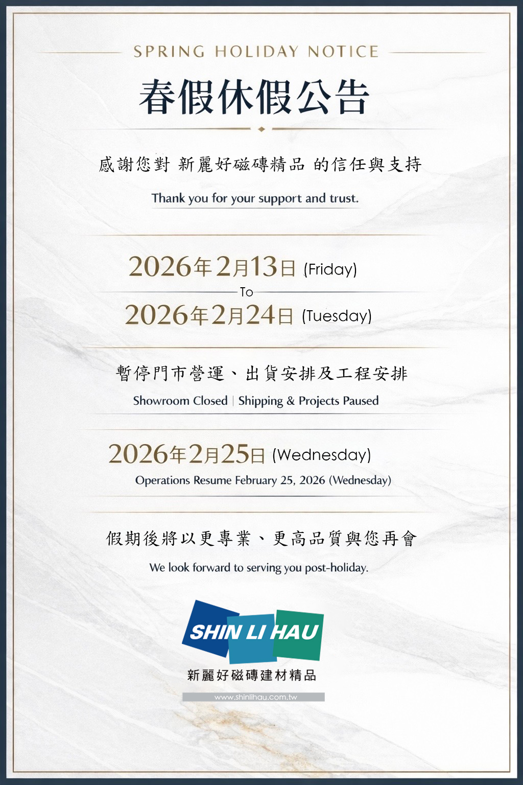 春節期間營運調整如下: 2026年2月13日(星期五)至 2月24日(星期二) 暫停門市營運、出貨及工程安排。